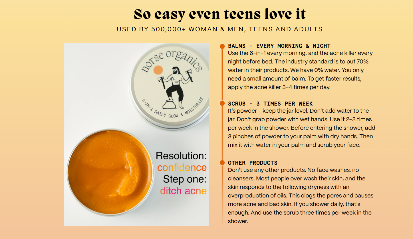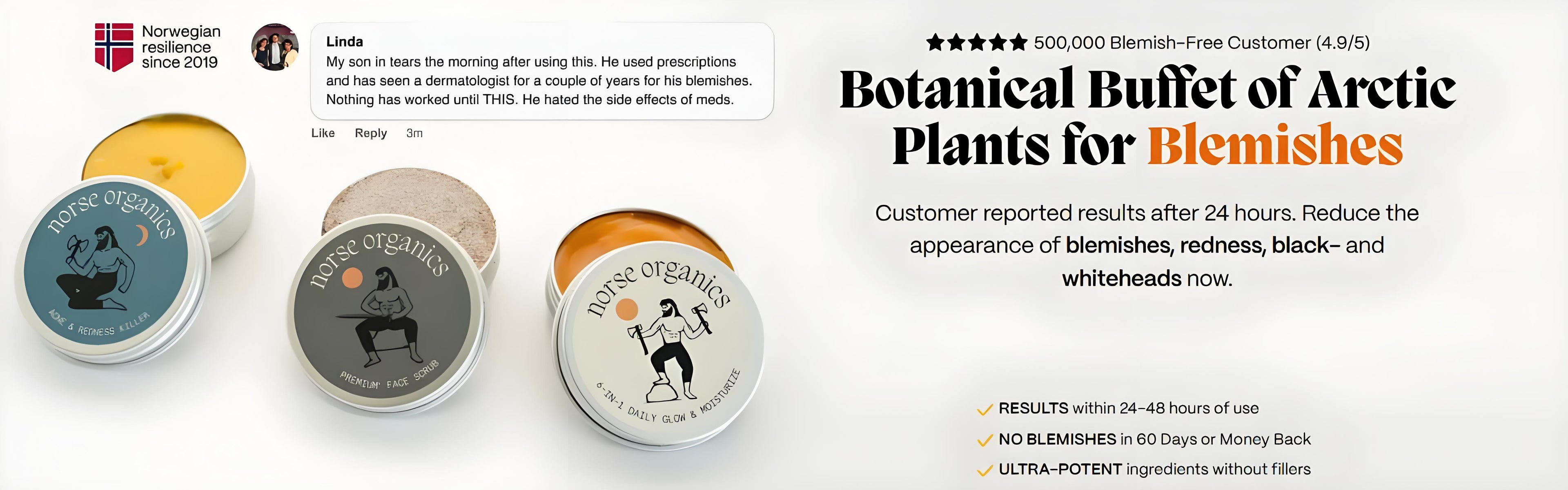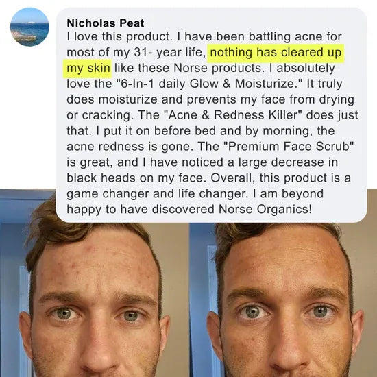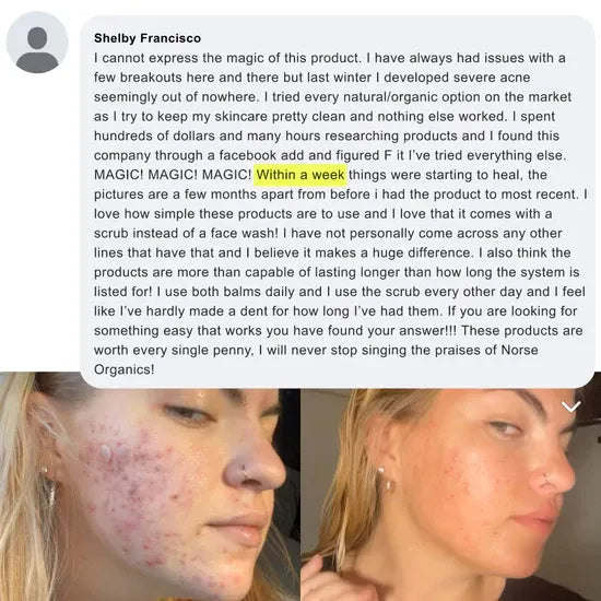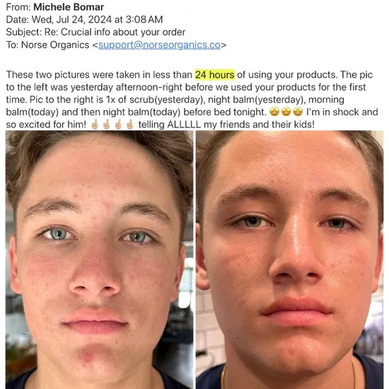 I have 15 year old triplet boys. I started Norse Organics with one that has pretty severe acne. Within a week, his skin is so much clearer! I’ve now ordered for his brothers as well. Thank you!